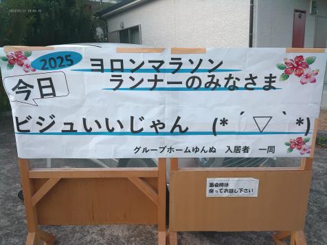 2025 ヨロンマラソン ☆ みなさま☆こんにちわ!!! グループホームゆんぬスタッフです♪♪ 与論もすこーし、肌寒くなることが多くなってきた この頃です!!! まだまだ暑い日もありますが。。。 そんな与論島 先日 ヨロンマラソンが開催されました!!! 島内はもちろん、全国各地、そして 外国の方の参加も多くみられ とても感動しました!!!! われらが与論徳洲会病院・院長 高杉院長も走っておられました(∩´∀`)∩ ちょうどグループホームゆんぬ前も フルマラソンコースになっていて 毎年、入居者みなさんと応援するのが 高齢となっています!!!! 今年の横断幕は‥‥ (笑)(´艸`*) ランナーのみなさんが、元気になってくださるように☆ 9時のスタートを合図して5分もしないうちに 最初のランナーさんが走ってこられます!! 応援される入居者のみなさんも少々ドキドキ☆ ランナーのみなさん、走っていて苦しいにも 関わらず 入居者さん皆さん応援に 笑顔で答えて下さる方。 タッチをしてくださる方。 「ありがとう」と手を振ってく出さる方。 なんだか すごく暖かい気持ちになりました(*´▽`*) 世の中、戦争や怖い事件が多い中、 人とつながること 本当に素敵ですよね☆ ヨロンマラソンランナーの皆様☆彡 本当にありがとうございました(*´▽`*) そしてお疲れ様でした!!! 島外からこられた皆様☆彡 来年のお帰りをお待ちしています(^^♪ 私もいつか走ってみたいな~(*ノωノ) ☆*: .。. .。.:*☆☆*: .。.。.:*☆☆*: .。. .。.:*☆ 入居者様の写真掲載につきましては 入居契約の際に承諾いただいております。 医療法人 徳洲会 グループホームゆんぬ ☆*: .。. .。.:*☆☆*: .。.。.:*☆☆*: .。. .。.:*☆