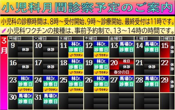 3月 小児科診察予定のご案内